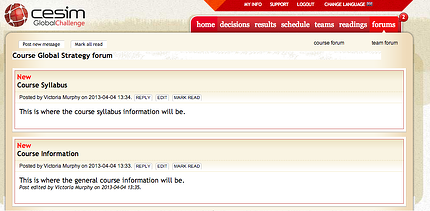 Although Cesim Business Simulations integrate well with learning management system you may already be using such as Moodle and Blackboard; if you want to keep everything related to the course in one place, you can utilize the Forum functionality to communicate vital information to your students. Announcements, general information, and the course syllabus can all be posted on the Course Forum for everyone to see. Your students will be notified via email of all Course Forum postings, and will be able to ask questions directly on the message board.