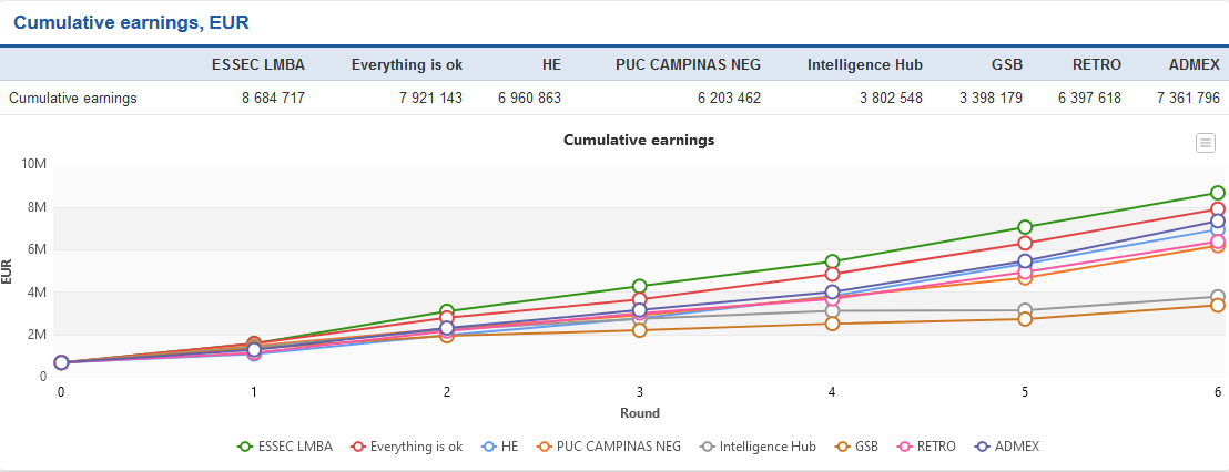 Over the rounds in the simulation, team ESSEC LMBA demonstrated a strategic focus on growth and financial stability, adapting effectively to market conditions. Initially, they diversified income streams across various vehicle categories and services like maintenance and spare parts, managing to consistently improve their gross margins, especially in new vehicles and workshops. Financially, they maintained strong cash flow and a healthy balance sheet, reflected in their increasing net profit and robust return on equity (ROE). Their strategy included adapting pricing, inventory management, and promotional activities to meet market demands and competitive pressures. By the final rounds, ESSEC LMBA focused on optimizing operational efficiencies and expanding service capacities to enhance market share and customer satisfaction, sustaining profitability.