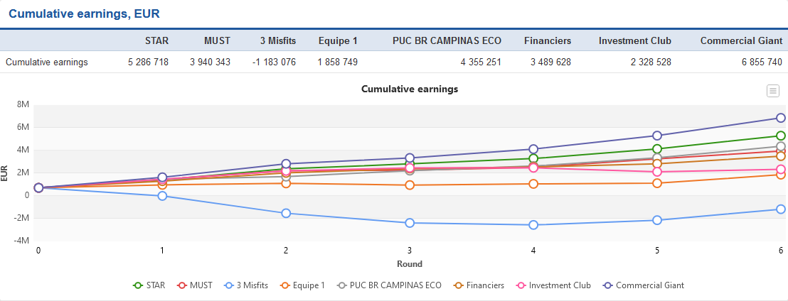 The team Everything is OK adeptly managed their dealership in the simulation, showing strategic agility over the rounds. Initially focusing on boosting sales across various departments, they invested wisely in advertising and personnel development, which helped increase market shares and sales efficiency. Throughout the rounds, they adapted to market shifts by enhancing their offerings in used vehicles and maintenance services, effectively managing their financials to grow net profits consistently. Their strategic adjustments in response to market conditions were evident in their improved inventory turnover and optimized cash flows. Human resource management was also a key focus, maintaining high competence indices and adjusting workforce levels to meet operational demands. By the end of the simulation, "Everything is ok" had significantly increased their cumulative earnings, showcasing their ability to navigate and thrive in a dynamic market environment.