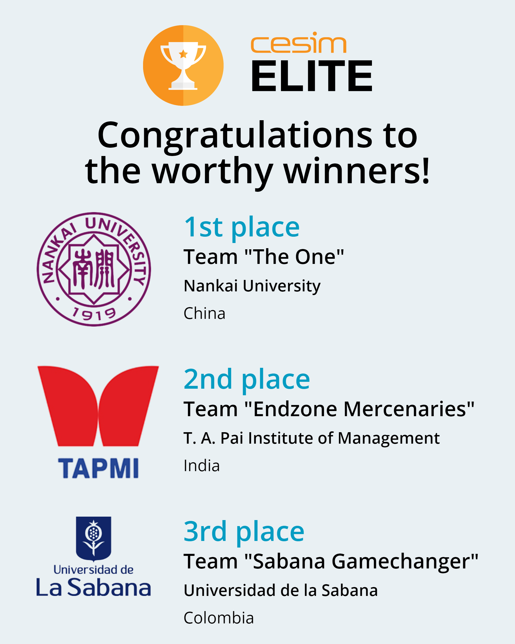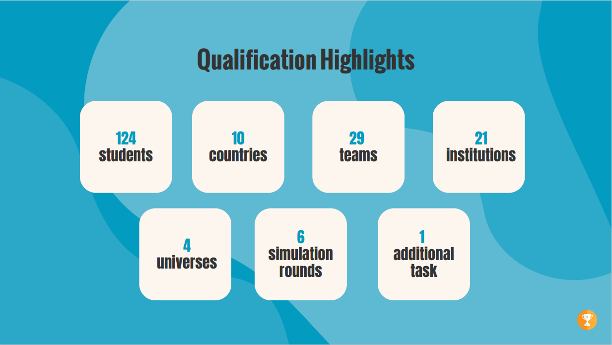 The Cesim Elite International Grand Final of this year took place during the first week of June, from May 29th to June 4th. In this final, 16 teams from 8 different countries competed, having been selected from a pool of over 9000 students. And now, the moment you've all been waiting for..."