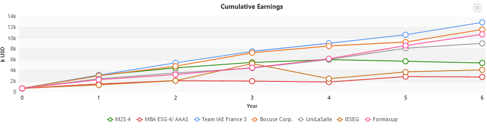 Les participants étaient motivés, avec plus de 812 heures de connexion cumulée sur notre plateforme à prendre des décisions ! Félicitations à toutes les équipes d'étudiants pour leur implication et performance, et en particulier aux équipes IAE France 2, Bocuse Corp. et IAE France 3 qui se retrouvent sur le podium.